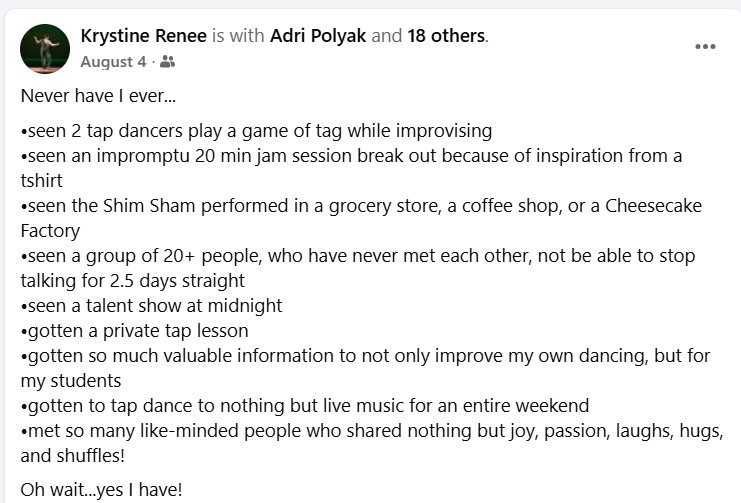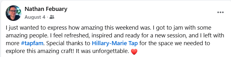 “This retreat brought me so much joy and fulfilment and was very confirming for me in my tap dance journey… If you’d like to be in the presence of greatness and have a weekend that feels like a warm hug… You will feel so proud to be a tap dancer, and you will gain new perspectives and have unforgettably fun experiences.”