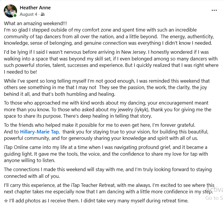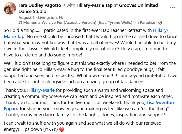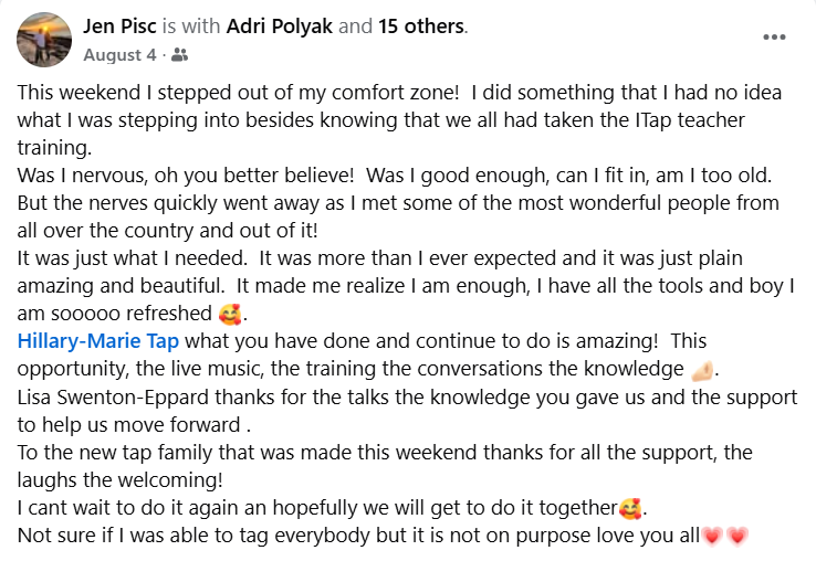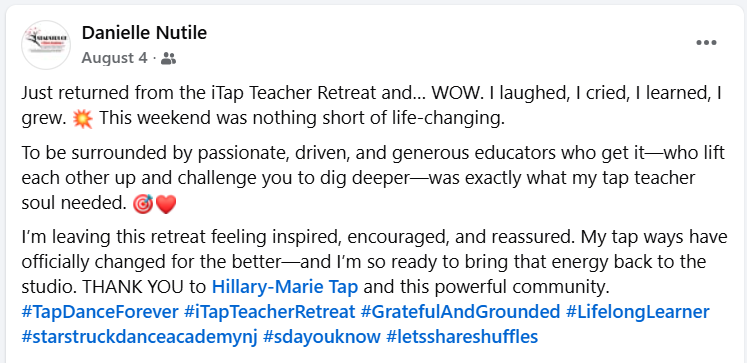 “The iTap Retreat was an absolutely incredible experience! Hillary-Marie was so welcoming and made everyone feel instantly at ease… My private lesson completely transformed the way I think about my teaching and my dancing. Beyond the lessons, I made amazing friendships, and the retreat was packed with uncontrollable laughter, impromptu tap jams, and an unbelievable amount of knowledge. I left feeling like I had grown so much as both a teacher and a dancer.”
